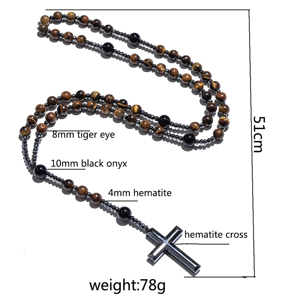 Collier Chapelet en Oeil de Tigre & Agate Noire – Croix Hématite pour Méditation & Foi